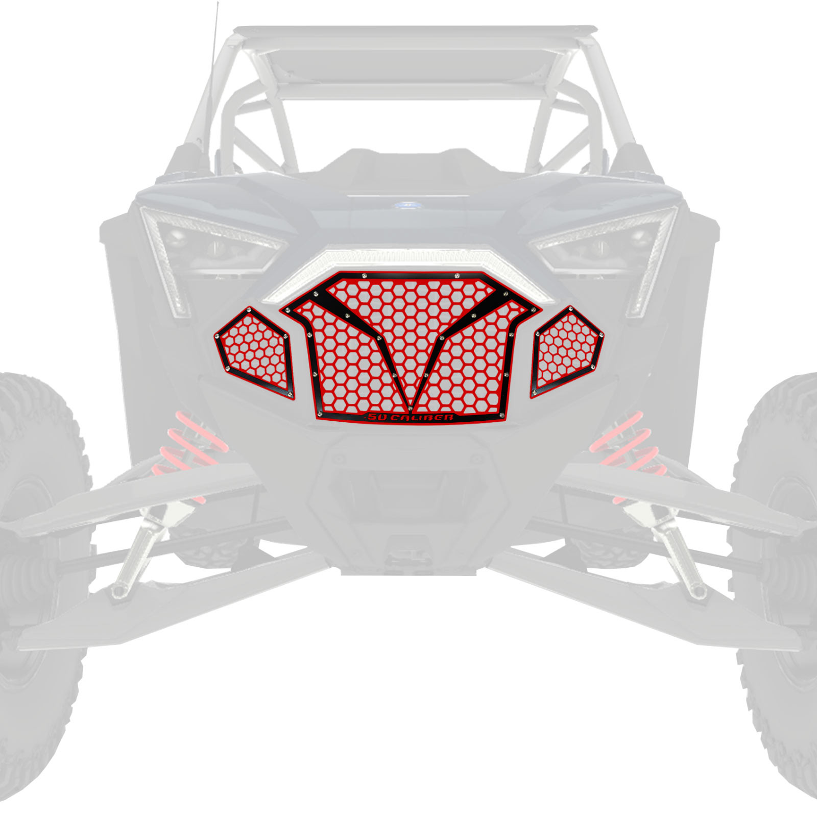 Add a killer look and increased air flow to your 2017-2018+ RZR XP Turbo with a 50 Caliber Racing CNC made 6061 billet aluminum grille. This is the most outside the box unique grille in the market, This grille transforms the look of your RZR drastically compared to the competitions grilles that are half its size. Available in several colors.