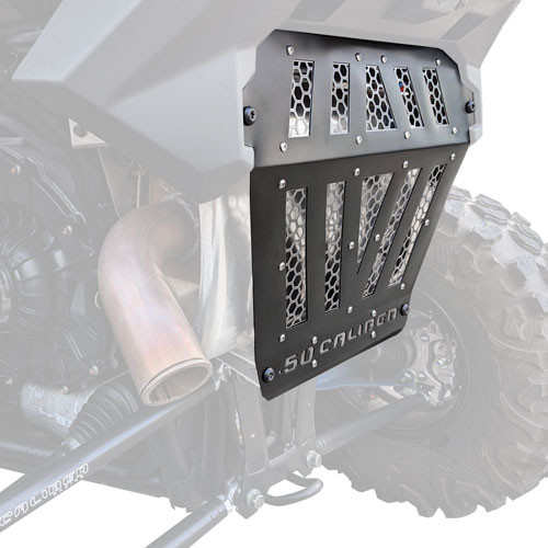 Custom heat shield exhaust cover for Polaris RZR PRO XP. Get rid of the ugly stock plastic rear "bumper" panel and add a more aggressive look to your RZR. Black powdercoat steel frame with honeycomb mesh allows for increased cooling, better departure angles, and some killer unique style. CNC laser cut from thin gauge sheet steel with 50 Caliber Racing logo at the bottom. 100% made in the USA! Fits 2020-2023 models. 2024-Up require brackets that are sold separately.