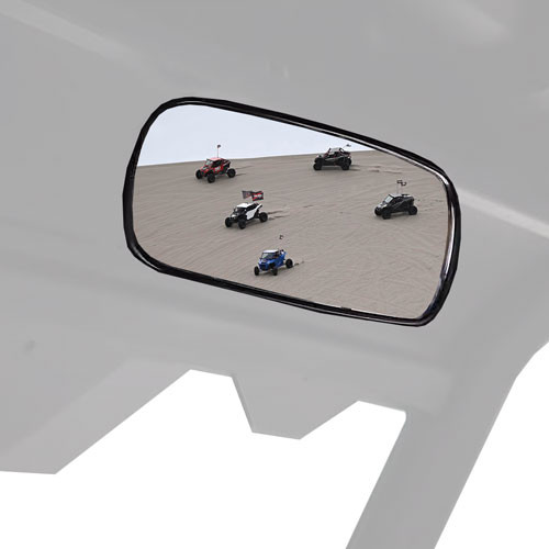 Set of two 50 Caliber Racing UTV side mirrors. Fully adjustable with shatter-proof tempered glass and ball socket joint for unlimited viewing angles. Actual mirror dimensions: 5.5″ x 9.4″ includes clamps for 2" tubing.