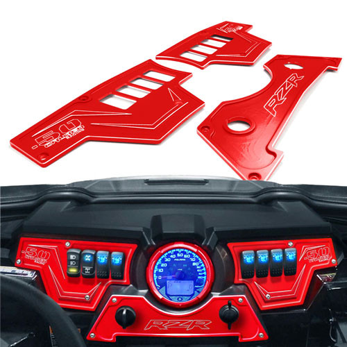 Custom 50 Caliber Racing CNC Billet Aluminum Dash panel plates for your 2015 and up RZR with factory interactive digital display and GPS option, including XP 1000, S 900, 900 Trail and 900 XC. This kit will allow you to mount your original switches, plus 4 additional full size switches for your lights and accessories. Kit includes dash panels and 4 waterproof rocker switches.Be sure to select color before ordering!