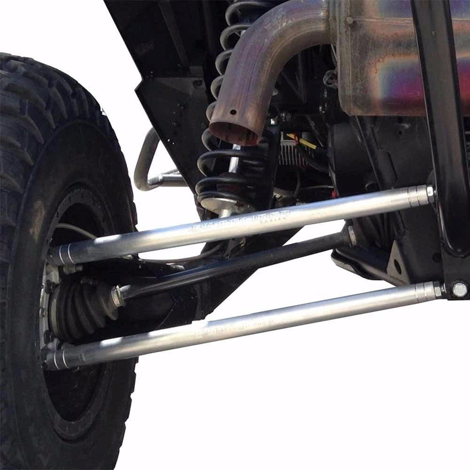 Stock RZR Radius rods are light-duty and frequently fail during aggressive driving, racing and jumping. When they fail they usually cause massive damage: destroyed shocks, bent trailing arms, and bent and/or wallowed out frame mounting tabs. 50 Caliber Racing Heavy Duty Radius rod kit completely solves this problem. With massive 1.25" billet rods, 4130 Chromoly 5/8" Heim joints with nylon / Teflon liner. This setup is bulletproof. Available in raw or powdercoat finish.Be sure to specify your RZR year & desired finish before ordering!