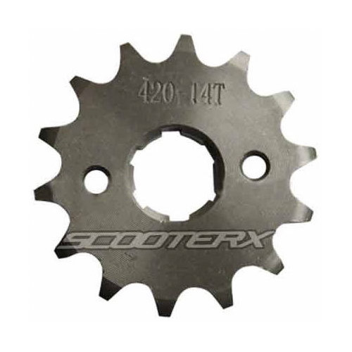 14 tooth sprocket fits a 420 chain and has a 17 mm inner shaft hole.