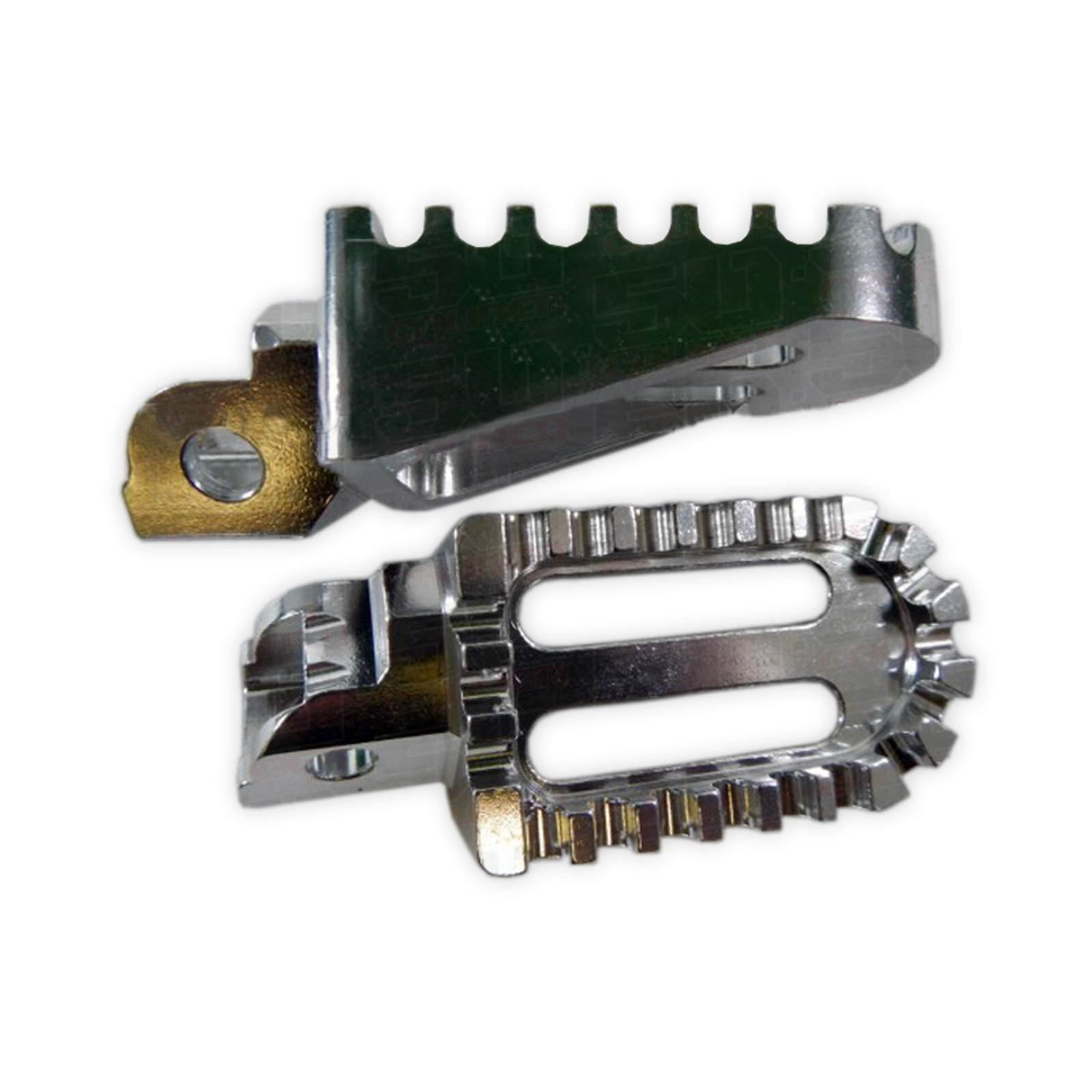 50 Caliber Racing oversized foot pegs for Honda and Chinese knock off pit bikes. Includes both right and left pegs. Oversize for a larger foot platform and solid aluminum for lightweight strength. They offer better stability and more room for larger riders. Available in several colors. Available in silver, red and black.Be sure to choose color before ordering!